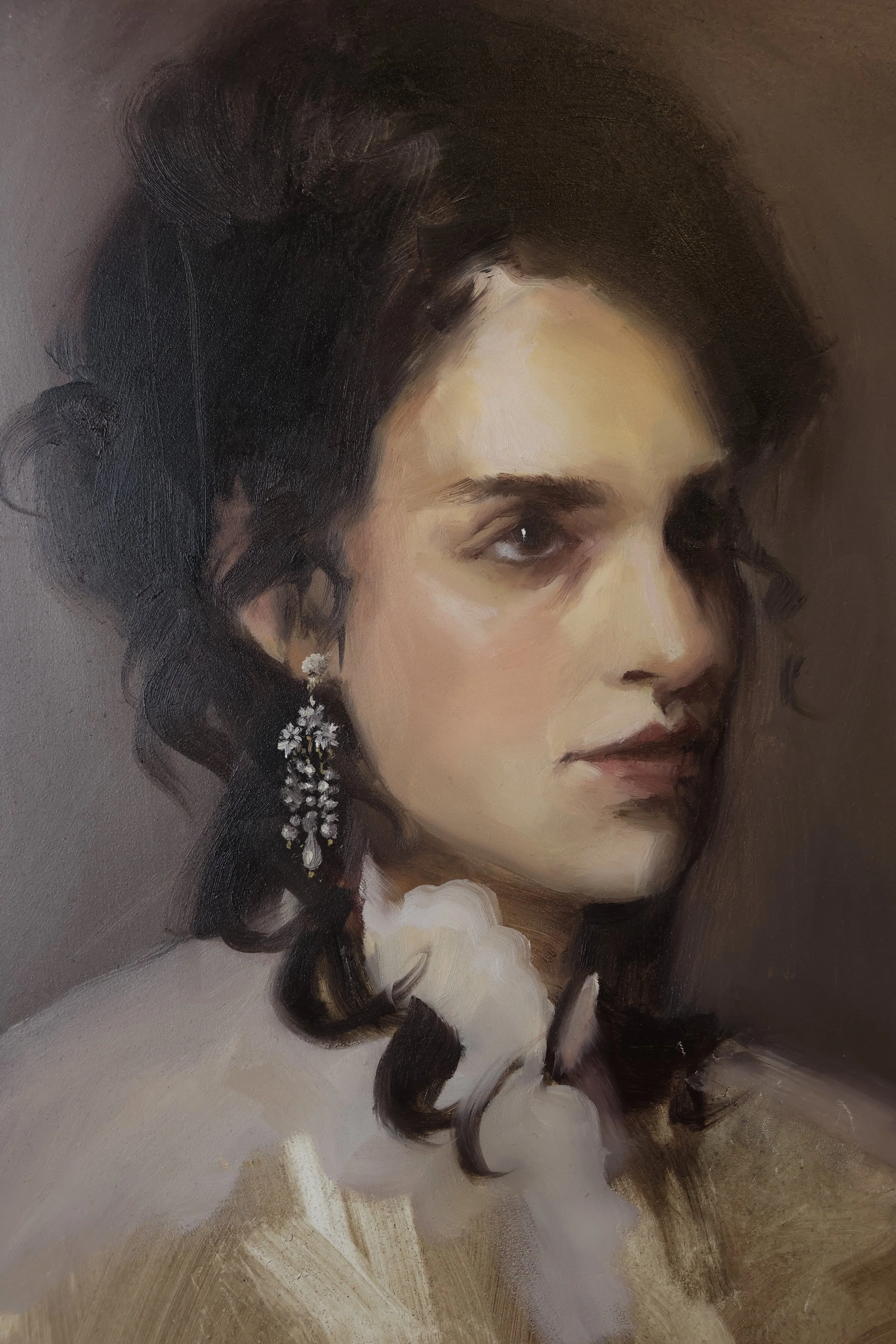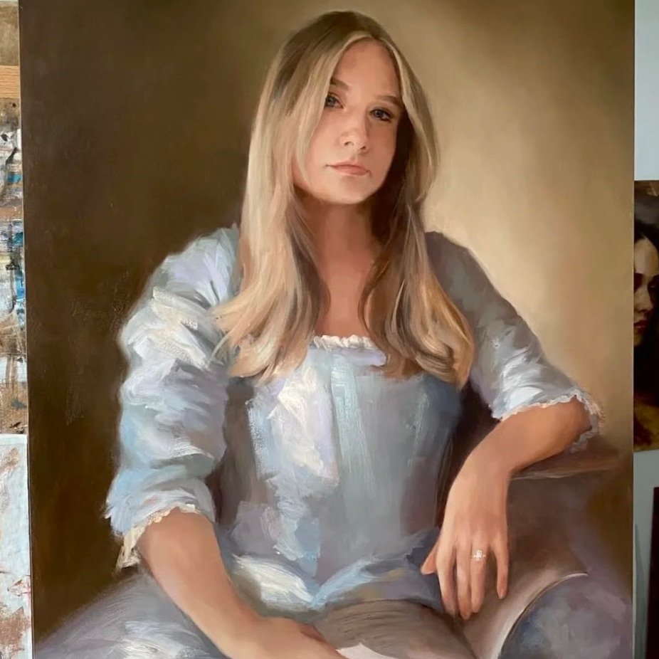 The painting is built slowly. Oil on canvas, layer by layer — until the likeness, the light, and the soul of the subject are exactly right.
